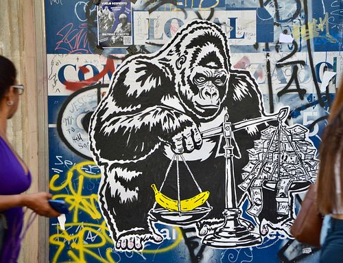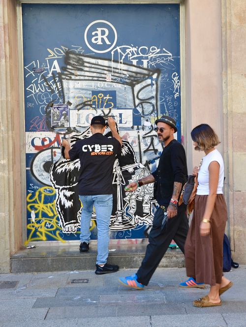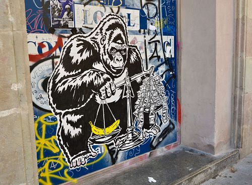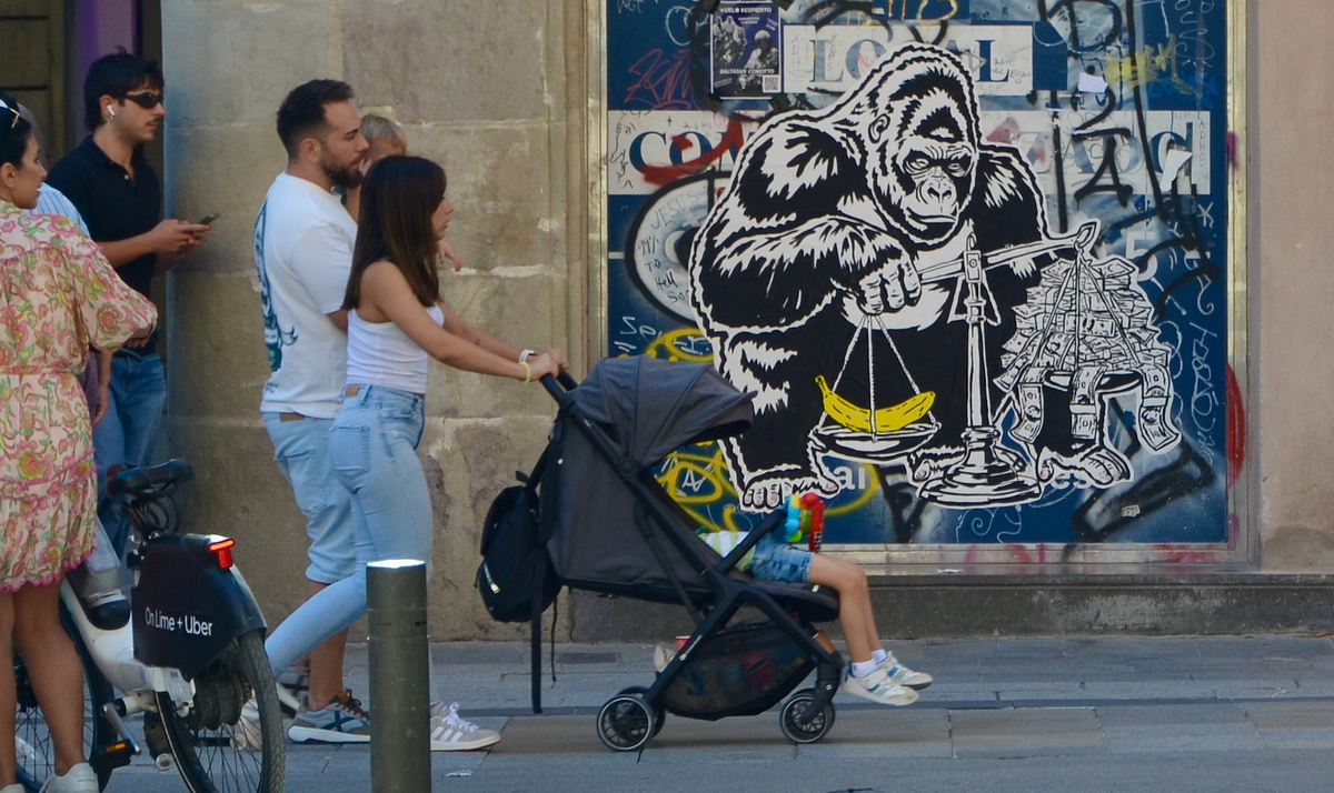 On Portal de l'Àngel, one of Europe's busiest pedestrian streets and a stone's throw from the historic Barcelona Cathedral, a new standard has been set. Our latest art installation, "The Ape Standard," is now live, forcing a moment of reflection amidst the constant flow of commerce and culture.