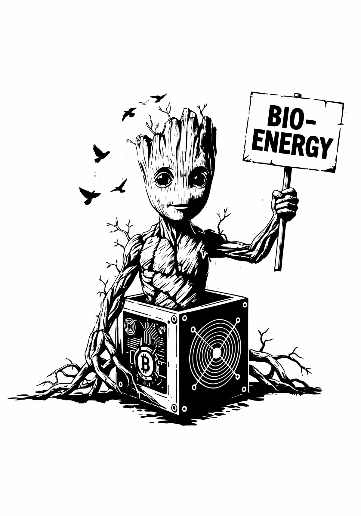 This is the world our "Bio-Energy" piece imagines: technology (the miner) isn't just taking from nature; it's creating a partnership. It helps turn farm waste into a secure, global money, creating a cycle where green energy and sound money help each other grow.