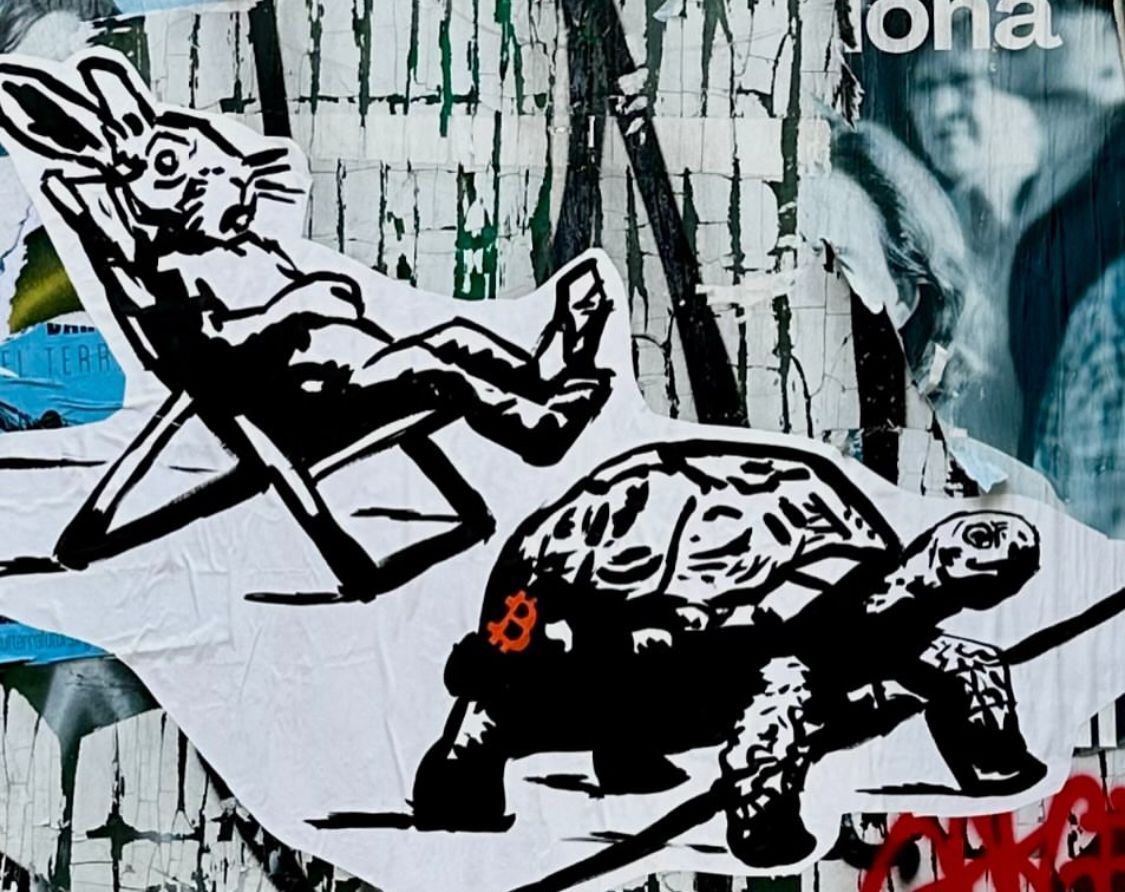 Meanwhile, the Tortoise continues. He is not fast, but he is relentless. He is secure in his hard shell, moving with a purpose that isn't measured in seconds, but in generations. On his shell, he carries the symbol of a new system: Bitcoin (â‚¿).